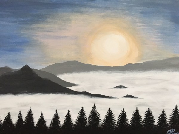 Ich bin von mir selbst begeistert, zumal ich anfangs keinen Tau hatte, wie ich eine Nebellandschaft malen soll – aber bitte: Nicht schlecht gelungen …